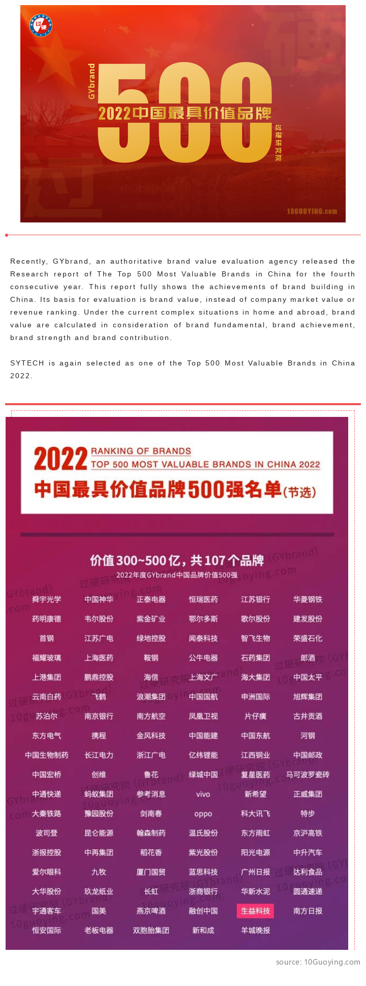 SYTECH Selected as One of the Top 500 Most Valuable Brands in China 2022