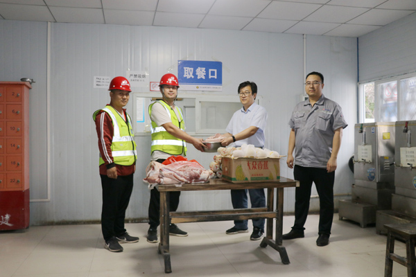 之后,劉志剛帶著月餅、豬肉等慰問(wèn)品到作業(yè)班組生活區(qū)對(duì)一線工人進(jìn)行慰問(wèn),在食堂劉志剛把豬肉遞到班組長(zhǎng)手里并囑咐他們一定要提高節(jié)日期間的伙食水平,讓堅(jiān)持在現(xiàn)場(chǎng)施工的工人吃好,消除他們的后顧之憂。