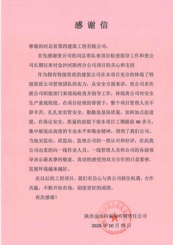 業(yè)主單位陜西金沙河面業(yè)有限責(zé)任公司在感謝信中,對公司管理團隊的專業(yè)水平和綜合實力給予了充分肯定,表達了今后與公司深化合作的意愿。來自不同單位的錦旗上,分別寫著“服務(wù)至上 誠信履約”“創(chuàng)精品工程 展鐵軍風(fēng)采”“技術(shù)創(chuàng)新 高質(zhì)高量”,充分體現(xiàn)了對公司管理團隊誠信守責(zé)、真抓實干、技術(shù)過硬、能打勝仗工作作風(fēng)的一致肯定。