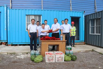 上午8點(diǎn),公司滿(mǎn)載茶葉、西瓜、蘋(píng)果、花露水等慰問(wèn)品的商務(wù)車(chē)緩緩開(kāi)進(jìn)職工生活區(qū),李懷生一邊給職工發(fā)放慰問(wèn)品一邊關(guān)心地詢(xún)問(wèn)他們的生活和工作情況,并叮囑他們有困難和問(wèn)題及時(shí)向項(xiàng)目部反映,還要求項(xiàng)目部一定要做好職工的后勤保障,讓大家消除后顧之憂(yōu)。