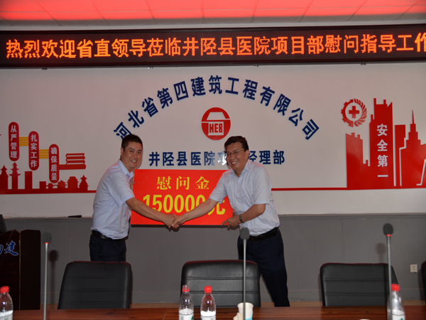 7月26日下午,河北省直工委副書記范金龍一行到二分公司井陘縣醫(yī)院項(xiàng)目部,對(duì)奮戰(zhàn)在一線的職工進(jìn)行暑期慰問,為他們送來(lái)了慰問金和慰問品。集團(tuán)工會(huì)主席王文利、公司黨委副書記、紀(jì)委書記、工會(huì)主席李懷生、二分公司黨總支書記孫立鋒一同參加。