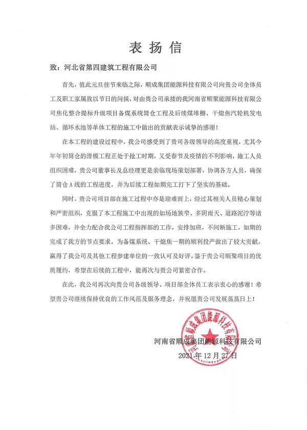 2022年元旦前夕,一封表揚信的到來讓十分公司的節(jié)日氛圍更添喜悅。2021年12月27日,十分公司河南順聚焦化項目收到來自業(yè)主方致公司的表揚信,對項目部攻堅克難爭當先鋒、誠信履約做出表率提出表揚,同時對項目管理團隊在備煤系統(tǒng)筒倉工程及后續(xù)工程施工中做出的貢獻表示誠摯的感謝。