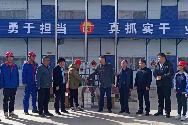 在會議室,唐志強聽取了項目基本情況匯報,詳細了解職工生產(chǎn)生活、勞動防護等方面情況。隨后深入施工現(xiàn)場,查看職工工作環(huán)境并與職工交流,傾聽一線職工聲音。C型料場正在進行擋墻主體施工,他叮囑現(xiàn)場管理人員高度注意安全,防止高空墜落。來到項目辦公區(qū),院內墻壁上“誠信守責、勇于擔當、真抓實干、業(yè)績服人”的工作總要求顯得格外醒目,“大家遠離家鄉(xiāng),在一線兢兢業(yè)業(yè),工作辛苦了,我代表公司工會來看望你們……”他向每位職工送上保溫杯、牛奶等慰問品,“內蒙古風沙大,最近天氣冷,大家一定要注意保暖……”他和職工一一握手問好,并送上殷切關懷。