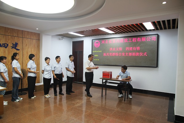 洪水無情,四建有愛。公司發(fā)揚“一方有難,八方支援”的中華民族優(yōu)良傳統(tǒng),9月7日—14日,僅一周時間,全體職工匯聚愛心捐助款項共計111723元,通過集團公司賬戶捐獻給易縣人民,用于易縣抗洪救災和災區(qū)人民重建家園。