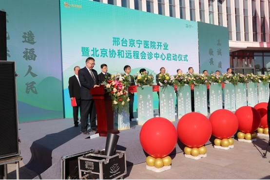 儀式現(xiàn)場(chǎng),彩旗飄揚(yáng),流光溢彩,處處洋溢著喜慶氛圍。在熱烈的掌聲與歡呼中,啟用儀式正式拉開(kāi)帷幕。楊曉明介紹了出席領(lǐng)導(dǎo)和項(xiàng)目使用功能,京寧醫(yī)院常務(wù)副院長(zhǎng)孟慶聚隨后登臺(tái)致辭。