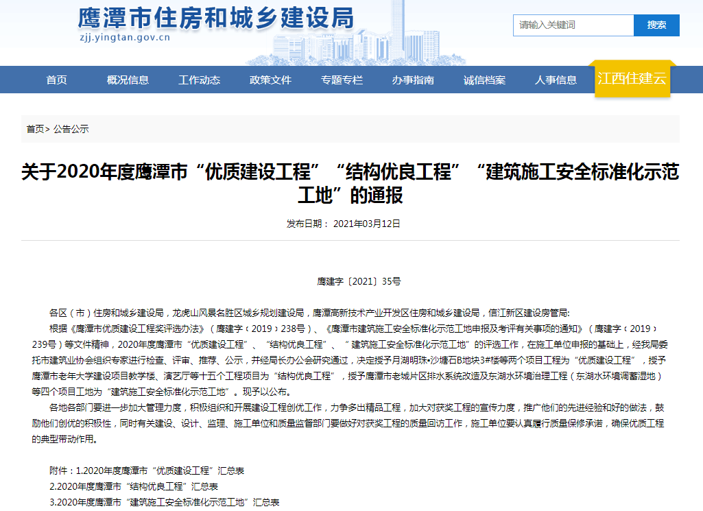4月12日,從江西省鷹潭市住房和城鄉(xiāng)建設局網(wǎng)站獲悉,四分公司承建的鷹潭市檔案中心項目喜獲2020年度鷹潭市結構優(yōu)良工程和建筑施工安全標準化示范工地兩項榮譽。