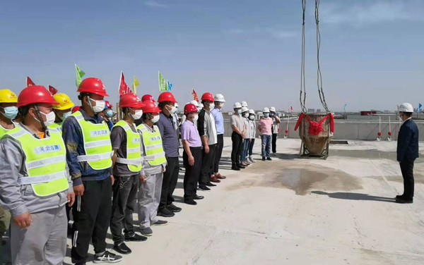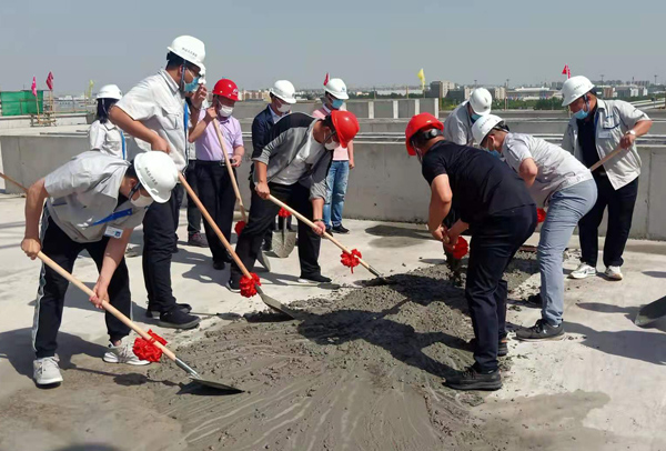 隨著建設(shè)方代表韋漢英總經(jīng)理發(fā)出“封頂儀式啟動”的指令,塔吊啟動、泵車轟鳴,正天車間大樓封頂儀式正式開始,扎著紅色彩球的混凝土泵送車揮動大臂從地面將混凝土泵送至樓上30米高處的布料斗,塔吊臂跑車滑動,承載著繡帶飄揚的料斗平穩(wěn)的將混凝土運送至澆筑點,三方人員拿起鐵鍬,揮臂鏟砼,完成了最后一立方混凝土的澆筑,共同見證了大樓主體的圓滿封頂。