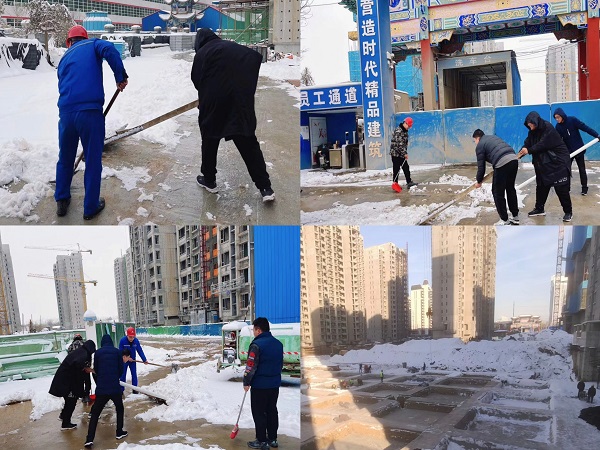 由于本輪低溫降雪持續(xù)時(shí)間較長,整個(gè)施工現(xiàn)場積雪不僅厚還很瓷實(shí),清掃工作十分困難。寒風(fēng)凜冽刺骨,但大家熱情高漲,充分發(fā)揚(yáng)不怕苦、不怕累的精神,黨員干部帶頭,職工群眾踴躍參加,按照分工好的清掃區(qū)域全面鋪開進(jìn)行。設(shè)備管理員系上安全帶爬上塔吊,清理積雪,先后對(duì)各類機(jī)械設(shè)備進(jìn)行維修保養(yǎng),檢查是否存在安全隱患;電工按照巡檢路線展開防寒防凍措施檢查,并對(duì)臨電周邊積雪進(jìn)行清理;其他管理人員掃的掃、鏟的鏟、相互配合,清除辦公區(qū)及生活區(qū)積雪;在施工區(qū)域,各分包隊(duì)伍清理道路積雪,對(duì)1#、2#、6#、10#住宅樓各層采取冬季保暖措施,并對(duì)門窗逐個(gè)進(jìn)行封閉;項(xiàng)目經(jīng)理帶隊(duì),加強(qiáng)現(xiàn)場巡護(hù),落實(shí)落細(xì)各項(xiàng)安全措施,確保雪后順利復(fù)工。經(jīng)過大家一個(gè)上午的通力合作,高質(zhì)高效地完成了掃雪除冰工作,確保重點(diǎn)區(qū)域沒有積雪結(jié)冰,切實(shí)保障了項(xiàng)目有序運(yùn)行。