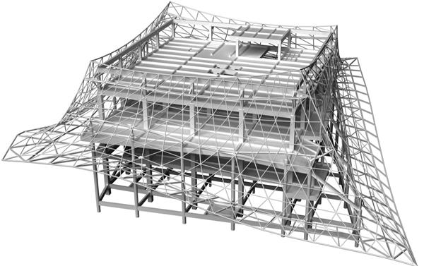該工程表皮結(jié)構(gòu)采用圓鋼管相貫焊接的單層鋼網(wǎng)格結(jié)構(gòu),局部采用平面鋼桁架,表皮鋁板采用白色穿孔鋁板,雙曲穿孔鋁板外圈穿孔位置距邊線20mm,其余穿孔位置為不規(guī)則孔。面對外裝飾層鋼結(jié)構(gòu)造型復(fù)雜、精度要求高等挑戰(zhàn),項目部依托BIM技術(shù)構(gòu)建數(shù)字化解決方案,通過Tekla軟件精確計算桿件內(nèi)力和優(yōu)化拼裝單元,將傳統(tǒng)的二維圖紙轉(zhuǎn)化為三維可視化模型,便于更直觀地理解復(fù)雜節(jié)點和施工流程。利用Navisworks和BIMFILM軟件進行施工動畫模擬,通過三維可視化模型編排制作吊裝順序,形成吊裝三維演示動畫,優(yōu)化施工順序和工序銜接,確保施工安全、質(zhì)量,有效提高施工效率。引入智能測量技術(shù),以全站儀、電子水準(zhǔn)儀等設(shè)備實時監(jiān)控安裝精度,形成“模擬預(yù)判+動態(tài)糾偏”的質(zhì)量保障體系。在鋼網(wǎng)架安裝前,將全站儀、電子水準(zhǔn)儀、GPS定位系統(tǒng)采集的數(shù)據(jù)進行綜合對比分析,提高測量放線精度,通過實時數(shù)據(jù)監(jiān)控及時調(diào)整施工過程中的誤差,實現(xiàn)動態(tài)糾偏。鋼網(wǎng)架拼裝單元安裝完成后,通過實際測量采集數(shù)據(jù)與模型進行對比,修正調(diào)整施工誤差。此外,項目部通過無人機掃描技術(shù)對安裝后的鋼結(jié)構(gòu)骨架成品空間坐標(biāo)進行驗收,為后續(xù)鋁板表皮安裝提供精準(zhǔn)數(shù)據(jù),確保建筑外觀效果與設(shè)計一致。